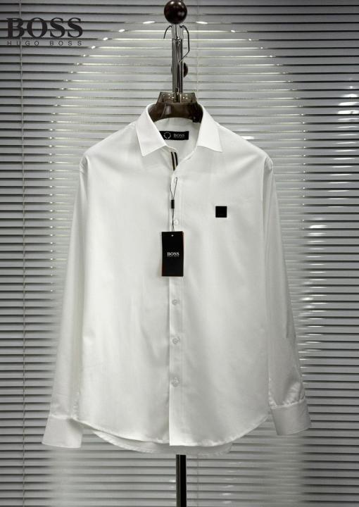 Hugo Bos s White Premium Imported Cotton Lycra Fabric Patch Logo Shirt with custom Branded Button Tagging And Brand Packing 3873
